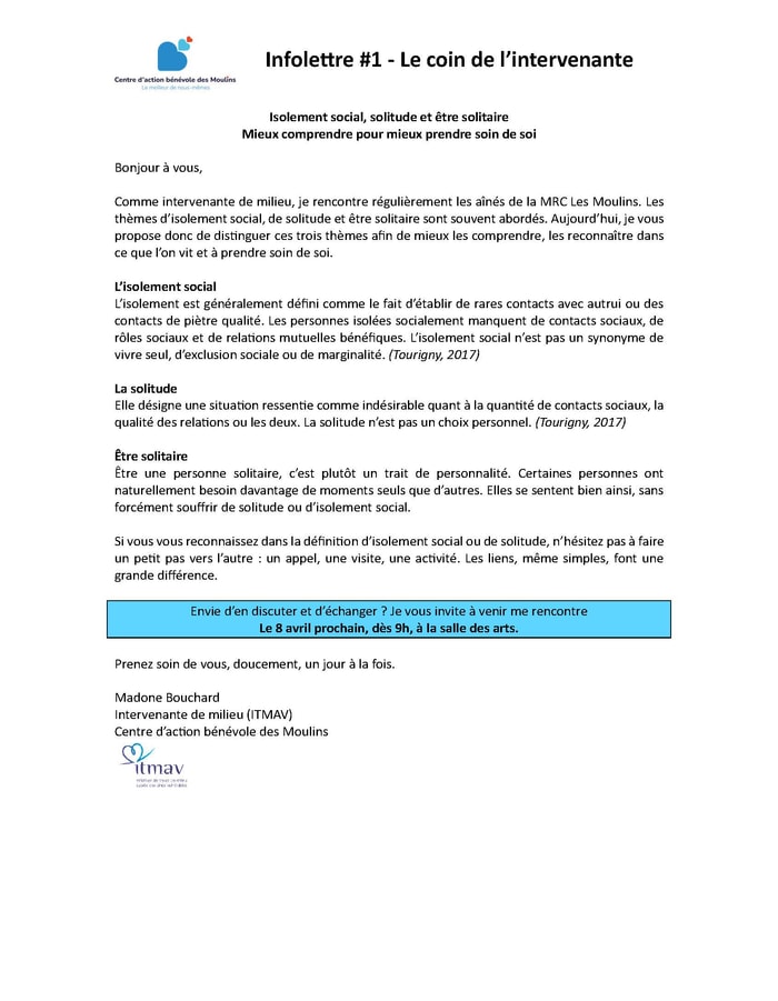 Comme intervenante de milieu, je rencontre rĂ©guliĂšrement les aĂźnĂ©s de la MRC Les Moulins. Les thĂšmes dâisolement social, de solitude et ĂȘtre solitaire sont souvent abordĂ©s. Aujourdâhui, je vous propose donc de distinguer ces trois thĂšmes afin de mieux les comprendre, les reconnaĂźtre dans ce que lâon vit et Ă prendre soin de soi.
