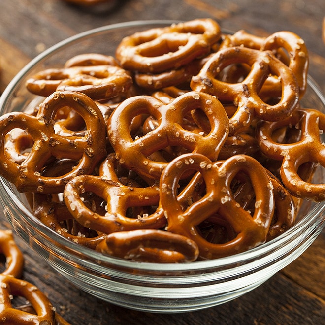 Bretzels et eau pétillante fruitée servie au Salon piano