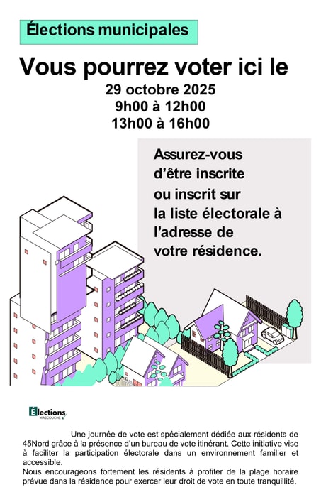 Le bureau de vote itinérant sera ouvert à la bibliothèque de 9h à 12h et de 13h à 16h. Assurez-vous d'être inscrit sur la liste électorale à l'adresse de la résidence.